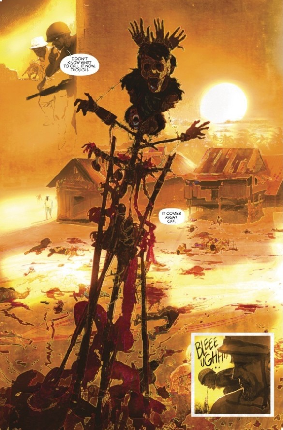 Camp embraces tropes of the superhero genre to tell this story, namely that of the “super-soldier.” The early days of superhero books are of course rife with the patriotic appropriation – or perhaps more fittingly, conscription – of superheroes for a war effort. Throughout the silver and bronze ages, superheroes were often stand-ins for geopolitical commentary. Camp pulls at some of these strings, and one catches different glimpses of the motif. Camp’s Platanov recalls elements of the most famous super-soldier of them all, Captain America, but there are also hints of the way Moore played with the notion of superheroes as agents of the state in Watchmen, and further connections to the aforementioned conscription of superheroes in the pages of All-Star Squadron or Invaders. Camp isn’t necessarily creating a pastiche, but rather embracing various characteristics of the super-soldier concept to create commentary laced with some clear deconstruction. There are elements of both Platanov’s visual characterization – that of a genius donning a robotic suit of armor – that obviously nods at Tony Stark while also winking at characterizations of both Dr. Doom and Reed Richards. Predominantly, though, 20th Century Men seems most rooted in the realism of DC’s war comics – Sgt. Rock, G.I. Combat, and modern incarnations of Unknown Soldier (to which the series has already drawn some comparisons).