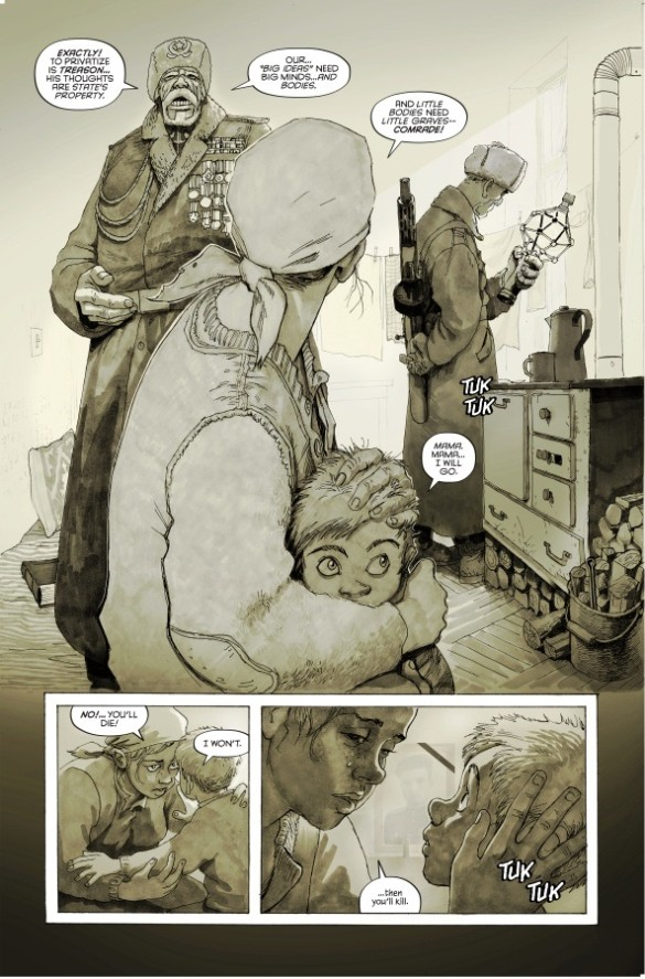 The story begins in some version of Vietnam. 20th Century Men inhabits a recognizable world, one with more overarching similarities than differences to our own. One of the things a reader will notice as they page through this issue is that Stipan Morian alters his artistic design for the different story lines and settings within the book. The opening feels painterly with a definite nod to impressionism. Morian will employ a type of painted realism for a good chunk of the book, but he will intersperse it with a distant kind of monochrome for the tragic early days of Platanov, our protagonist of sorts. Camp’s story jumps around to the highlights of the Cold War – from Vietnam we travel to 1948 Moscow before making our way to Kabul in 1987, Russia in 1968, and San Francisco in again 1987. I appreciate how distinct the feel for each of these settings is thanks to Morian’s unique touches that change the tone of each mini-story.