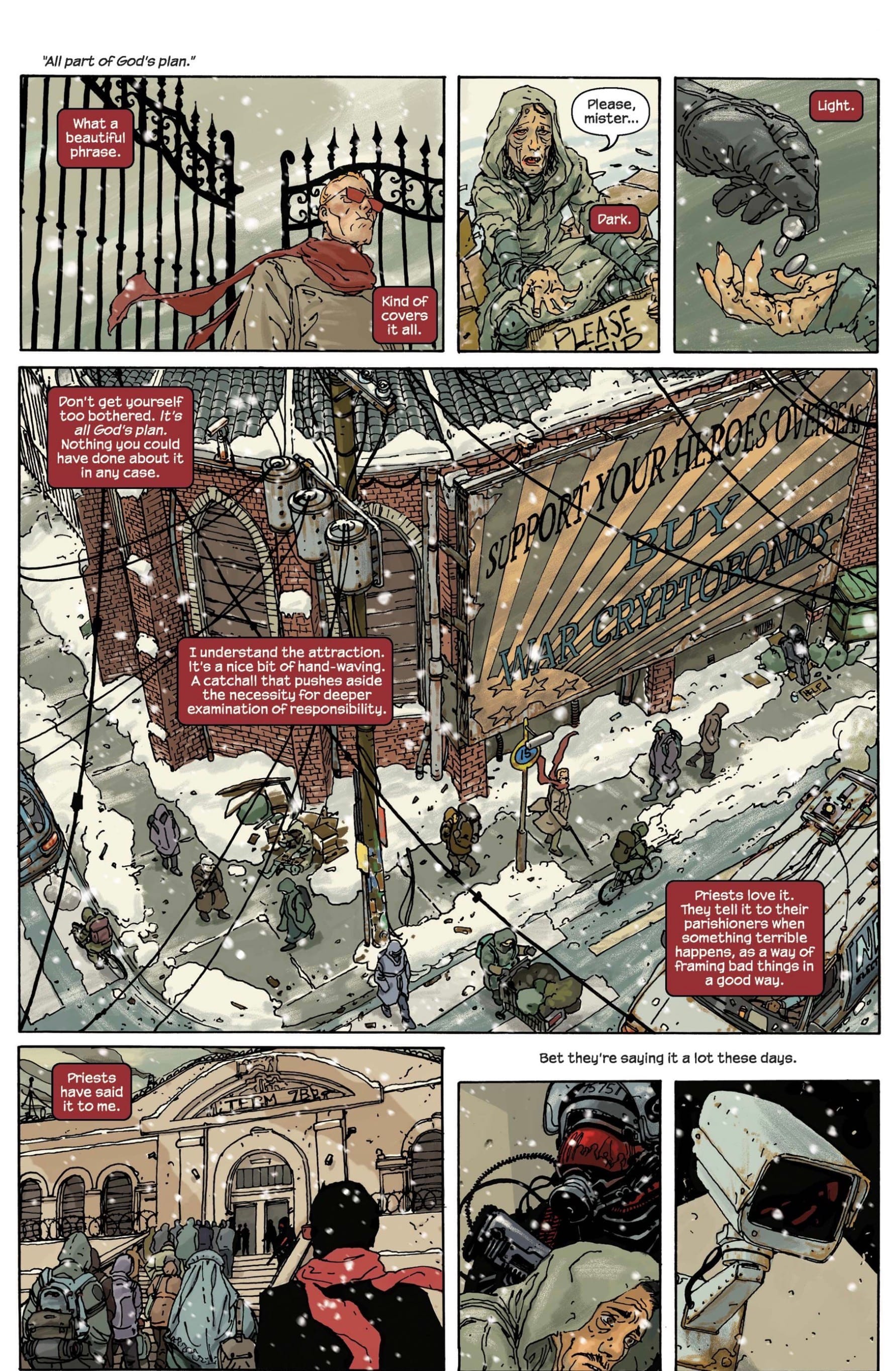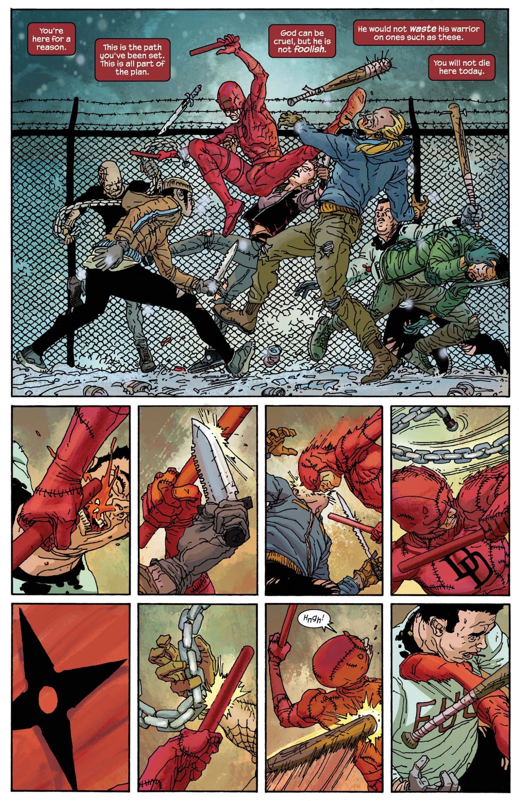 As the story opens, Matt Murdock is no longer a superhero or a lawyer. He’s an old man running a soup kitchen, his powers long ago faded. Of all the roles he’s tried to assume over the years, this seems the most appropriate for the character— his Catholic guilt finally leading him to serve people in a simple yet vital way. Returning to a war-ravaged Manhattan after visiting an old acquaintance’s grave on Staten Island, Murdock reflects on his life and how it has been “all part of God’s plan.” At least, that’s what he tries to convince himself. “Priests love it. They tell it to their parishioners when something terrible happens, as a way of framing bad things in a good way” he muses. “Framing bad things in a good way” is practically the story of Daredevil. After a subway explosion triggers the reactivation of his heightened senses that made him Daredevil, Murdock finds himself embracing his old superhero ways to protect a young girl who is the hunted by an old adversary, Bullseye.