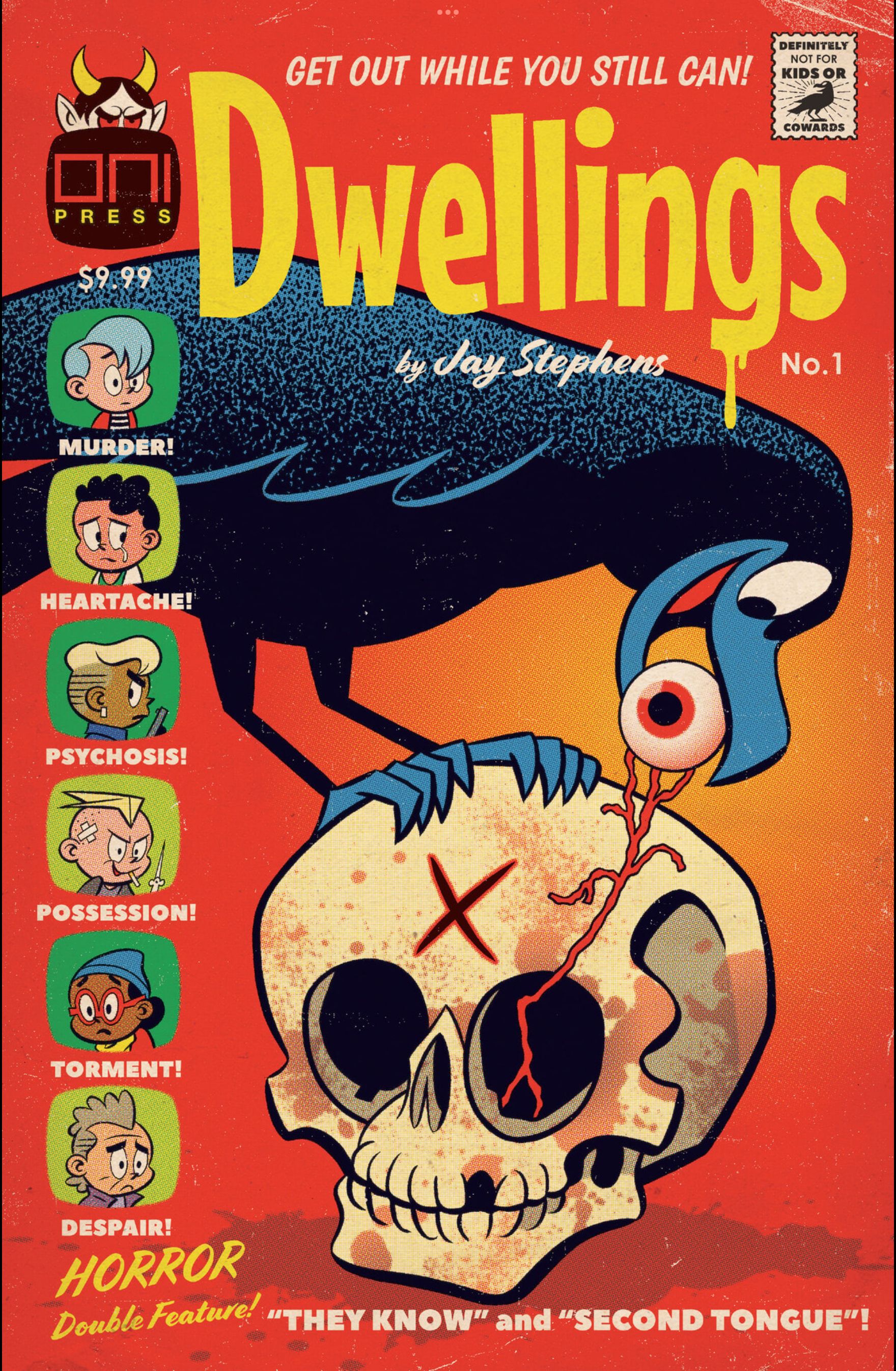 Cartoonist Jay Stephens’s new book Dwellings #1 comes from that imagined world. But in this world, the stories in the comics have not remained stagnant kid stuff. Just like in our world, new writers and artists have come along in this dreamt-of world to push comics so we would get crime comics, romance comics, action comics, and yes, even horror comics where the stories have developed to match the growing tastes of their audiences and creators. Back in the 1990s, Jay Stephen’s already had one foot in this world; during the Image Age of comics when everyone tried to look like the bastard child of Rob Liefeld and Jim Lee, Stephens was giving us wonderfully retro books like Tales of Atomic City and The Land of Nod. Before he abandoned us for presumably a better-paying gig, Jay Stephens’s stories harkened back to a different mode of comics than the grim-and-gritty zeitgeist that was the 1990s.