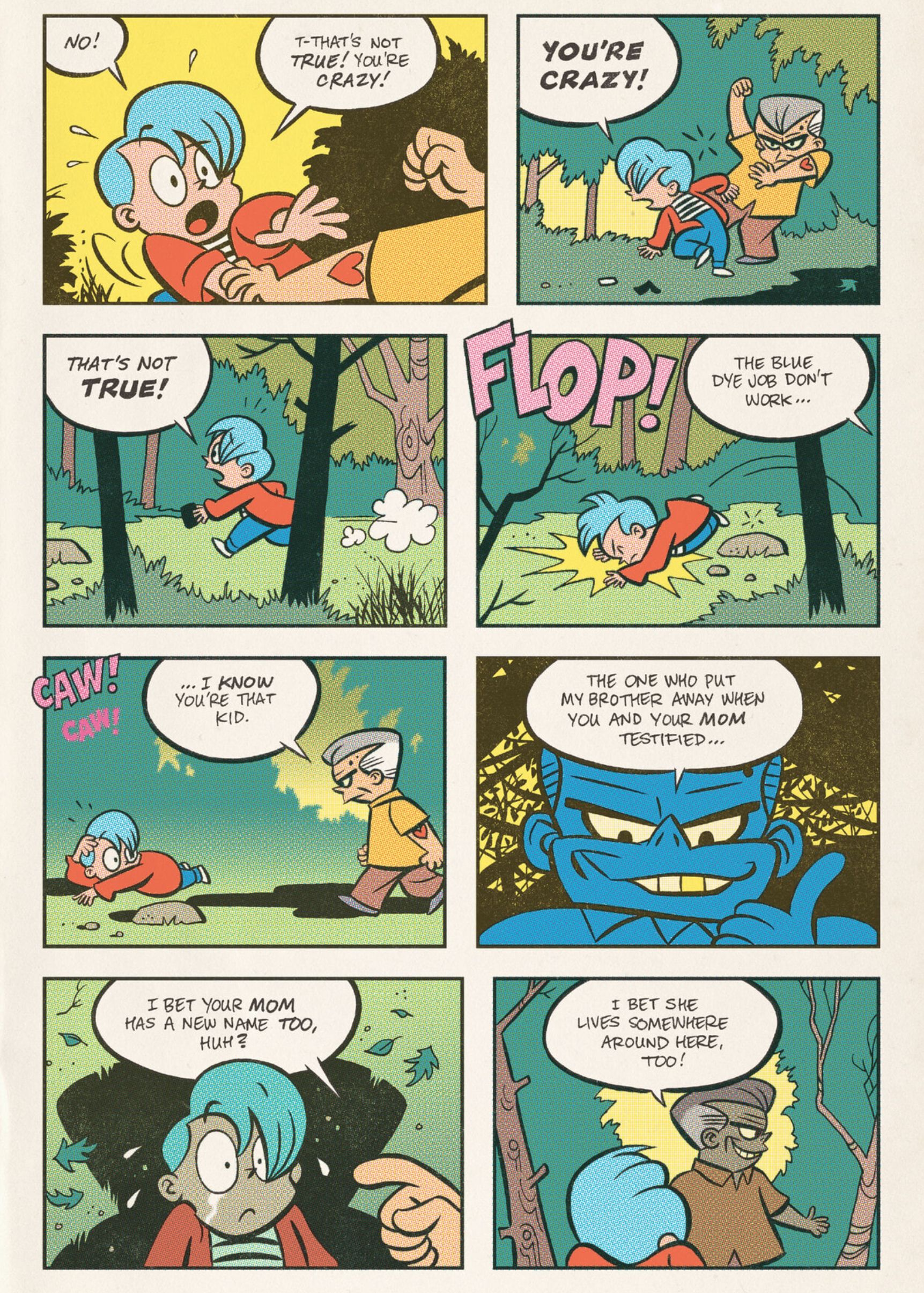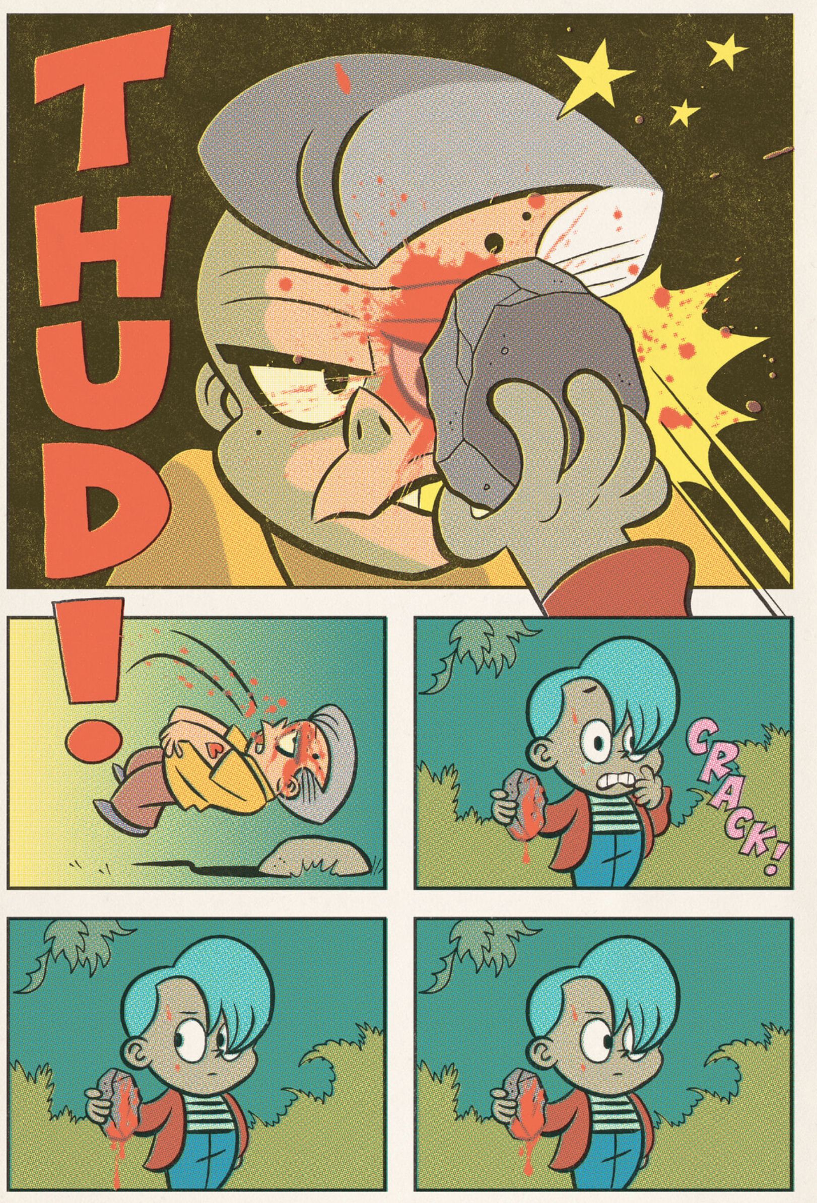 Somehow, these stories manage to be disturbingly dark but adorably cute. Stephens navigates this tension between his images and his plot, drawing these creepy and suspenseful stories in a clear and bouncy style. But it’s almost scarier this way because there are none of the usual ways to hide what’s happening- no shadows or visual misdirections. After all, that’s just not built deeply into the vocabulary of this kind of cartooning. In the first story, after 19-year-old Jordan kills a man in a park, his descent into madness is almost worse because he looks like any other precocious kid. It’s like Richie Rich had a psychotic breakdown and killed everyone in his family; it seems like most versions of that today would be drawn in a more realistic style (see Archie Comics’ recentish attempts at horror) as if bringing the characters more into a world that we would expect those horrors to occur in. Stephens keeps the style and the visual rules of these kids’ comics firmly in place but he unleashes a spiritual darkness on them that seems even more insidious because of our perceived innocence of these child-like characters.
