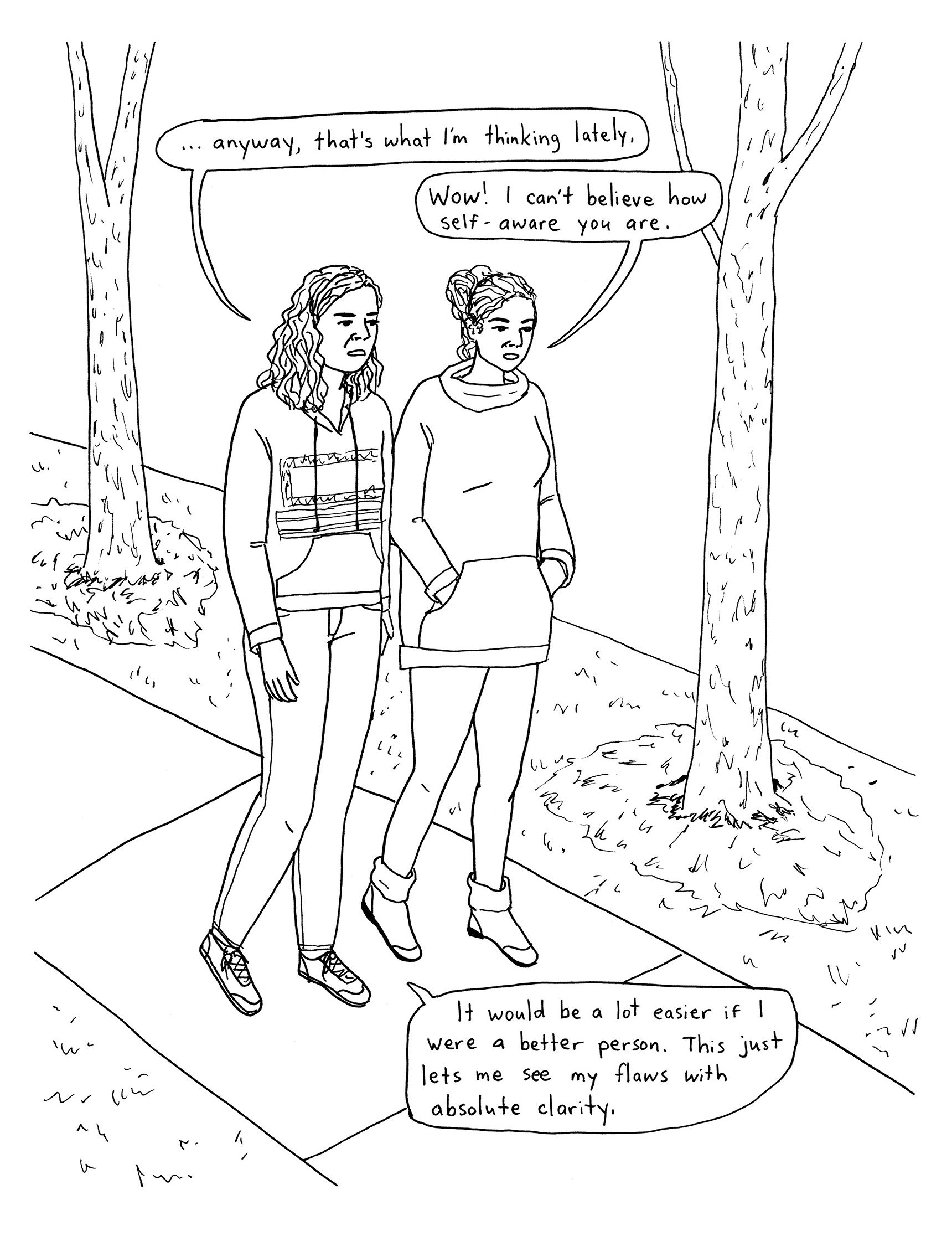 There is a certain element of realism inherent to the style. Life keeps trudging along; there aren’t massive plot points or emerging conflicts to create a functional plot. Rather, like Roberts' thin and quick sketch style of cartooning, the plot is just the wispy ins and outs of everyday life - no definitive moral, no grand narrative. Ideas and concepts occasionally return, and there are certainly thematic elements - coping with mental health, coping with developing MS, the anxieties of motherhood - that permeate the book. But it is almost the inconsistencies that shine the most, the way Roberts can capture the fact that even though they are stacked upon one another, moments need not necessarily feel chronological. She essentially embraces the entropy of the mundane. My Begging Chart is billed as a memoir, and it is. But it’s more of a self satire, a cathartic slice of life assault on the author’s world. It is a brutal book without ever seeming so. This is it. This is the confrontation with the world around us.