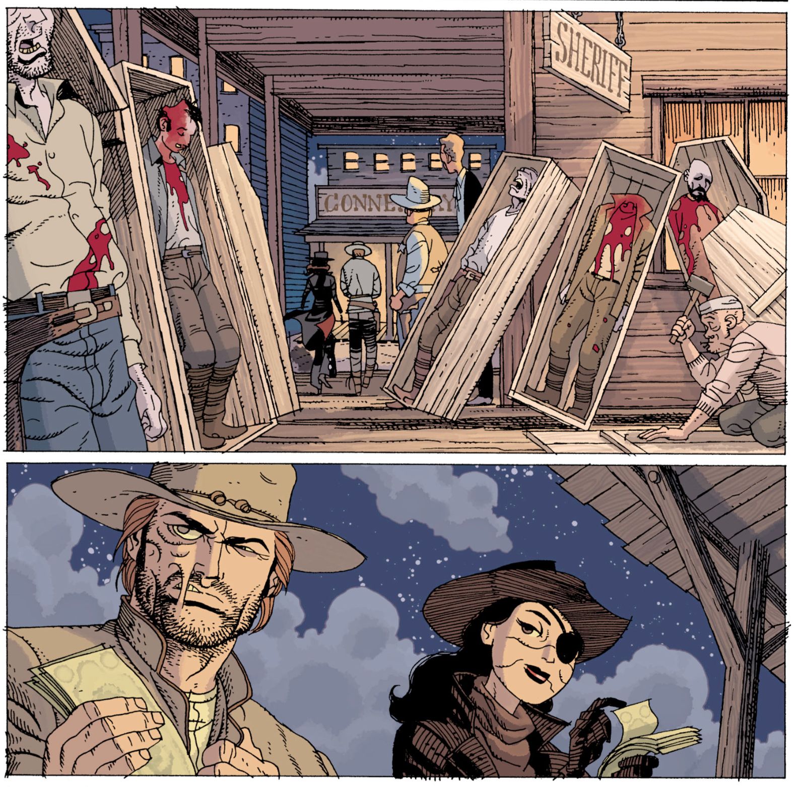 During most of this issue, Hex is on the hunt for the killers of children; the killers of sons and daughters. It starts out as just business at first, as Hex almost seems to be playing with his prey. There's a great two-page montages where Cooke draws Hex dragging a priest out of his church, shooting his bounties inside a saloon, and even waiting outside of an outhouse for his bounty to finish up his own business. It's funny and it's easy for Hex. By the end of the issue, maybe when Hex understands a bit more about how these men killed someone's son, he's quick, merciless, and brutal. He doesn't hunt them one by one, playing cat and mouse with them. He sits with his gun, waiting to kill them all at once. He kills them with a pain that may be only a father could understand.