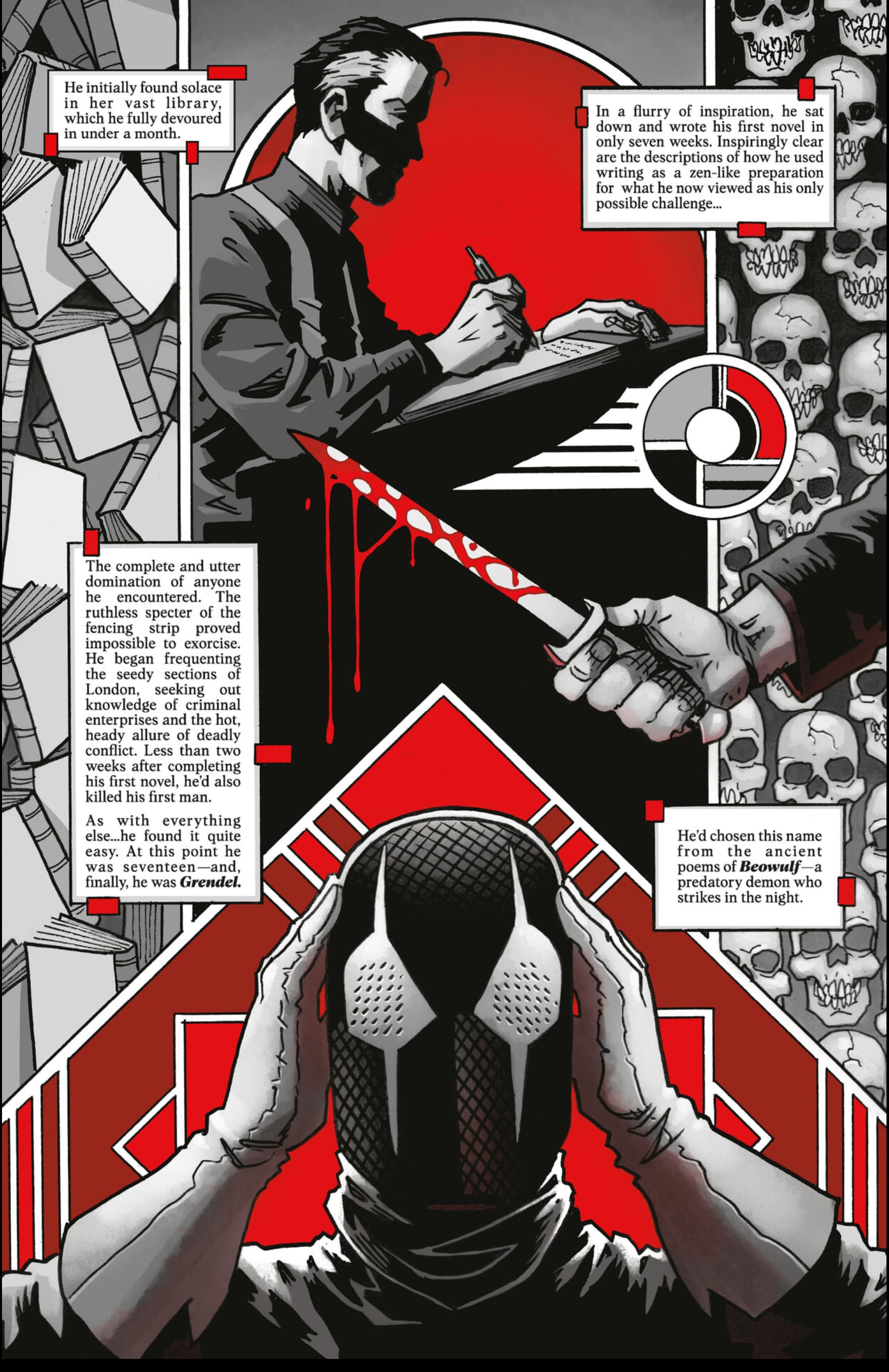 So here it is 2023 and Matt Wagner feels the need to revisit and redo Devil By The Deed with a Master’s Edition. It almost feels like he’s trying to do the comic equivalent of a “Taylor’s Version” but he goes much further than just trying to recreate an older work— he retells it and expands on it. Almost since the original publishing end of Devil By The Deed, Wagner has been returning again and again to Hunter Rose, filling in the blanks of his life that the first book left unseen. We’ve seen crossovers with Batman and the Shadow, short stories told with black & white & red colors, and miniseries that tied Hunter Rose’s story with the Grendel legacy that followed his life. Wagner has told a lot of Hunter Rose’s story but here he returns to doing that in the original format; as a true-crime biography about a mysterious costumed crime lord.
