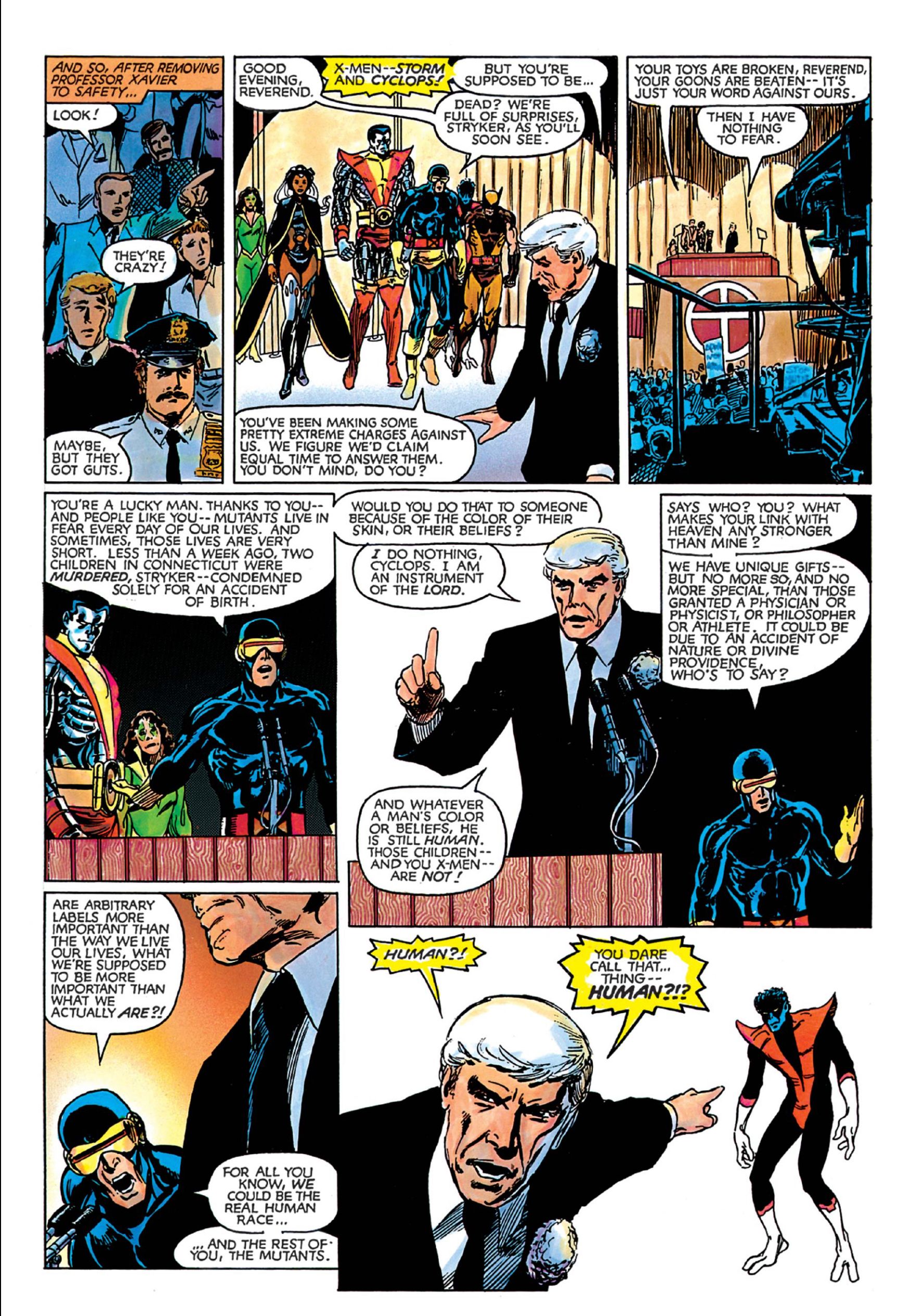 Around “Days of Future Past,” Claremont started to explore that more, suggesting that we would have concentration camps for mutants in the not-too-distant future. For some reason, back in 1980, that seemed very pessimistic but as we look at the past 100 years of history, particularly of the United States, it honestly doesn’t seem that unrealistic to imagine, especially if mutants would ever have been viewed as threats to “the American dream.” So by 1982, with the “God Loves/Man Kills” graphic novel, Claremont goes all the way and has the X-Men as the target of religious extremists, proposing the annihilation of mutants as a race all in the name of genetic purity. It’s still quite shocking how the Brent Anderson-drawn graphic novel draws lines from mutants to Jews and Black people and the inhuman persecutions that comprise the histories of those two peoples.