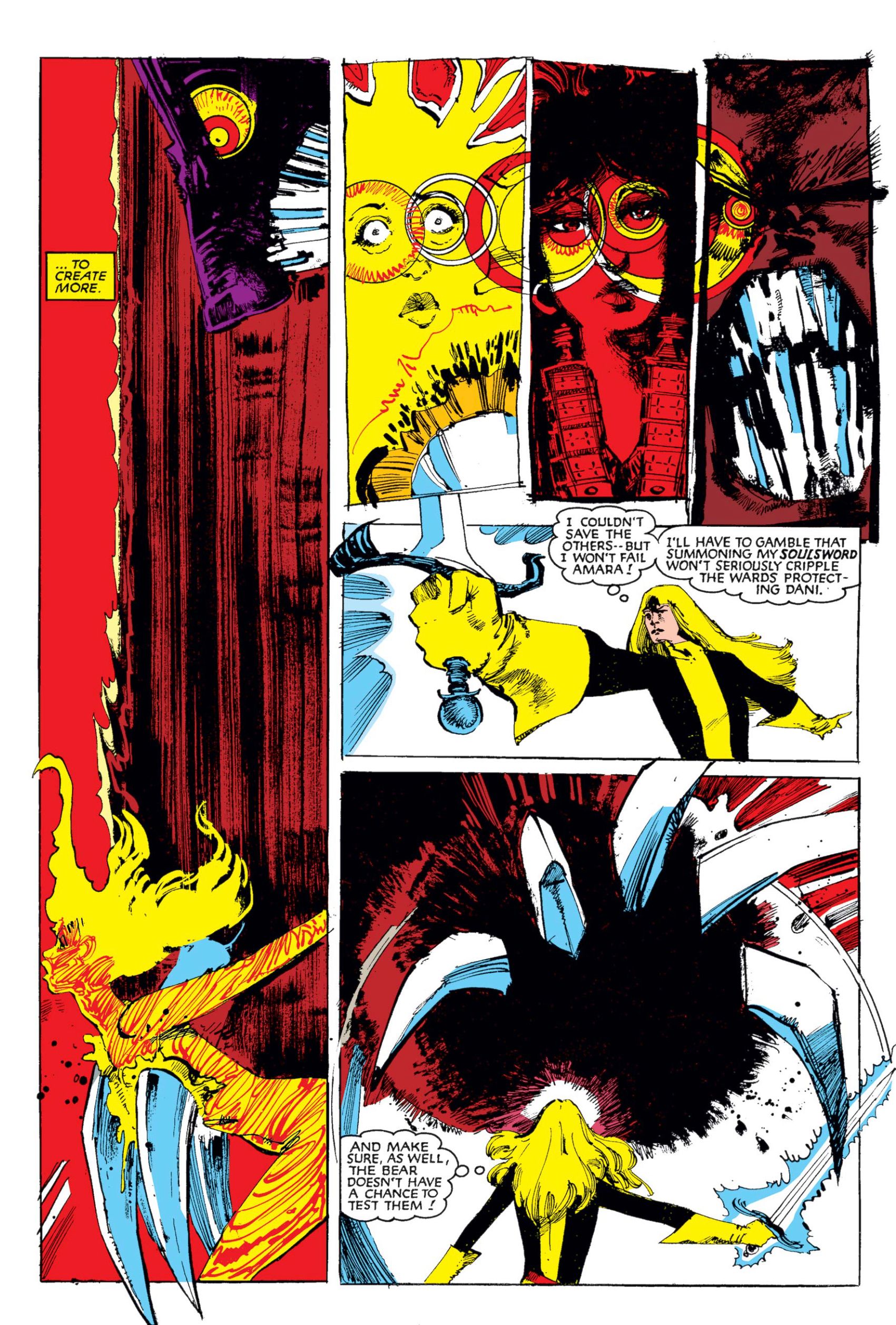 McLeod and Buscema are solid artists in the modern Marvel way so it’s quite a shock when Bill Sienkiewicz takes over in The New Mutants #18. He had done a few issues of Uncanny X-Men before this, where more of his Neal Adam’s influence showed through. But with “The Demon Bear Saga” (everything’s a saga here,) the title turns into a dark horror, where the threat is far more psychological than physical, even as one of the team lies nearly dead after a horrific attack by the spirit bear. Claremont and Sienkiewicz hit on something as the series finds an identity of its own, visually. With John Romita Jr. on one book and Bill Sienkiewicz on the other, Claremont finds this period where he has two books that are connected but have distinct flavors thanks to the artists.