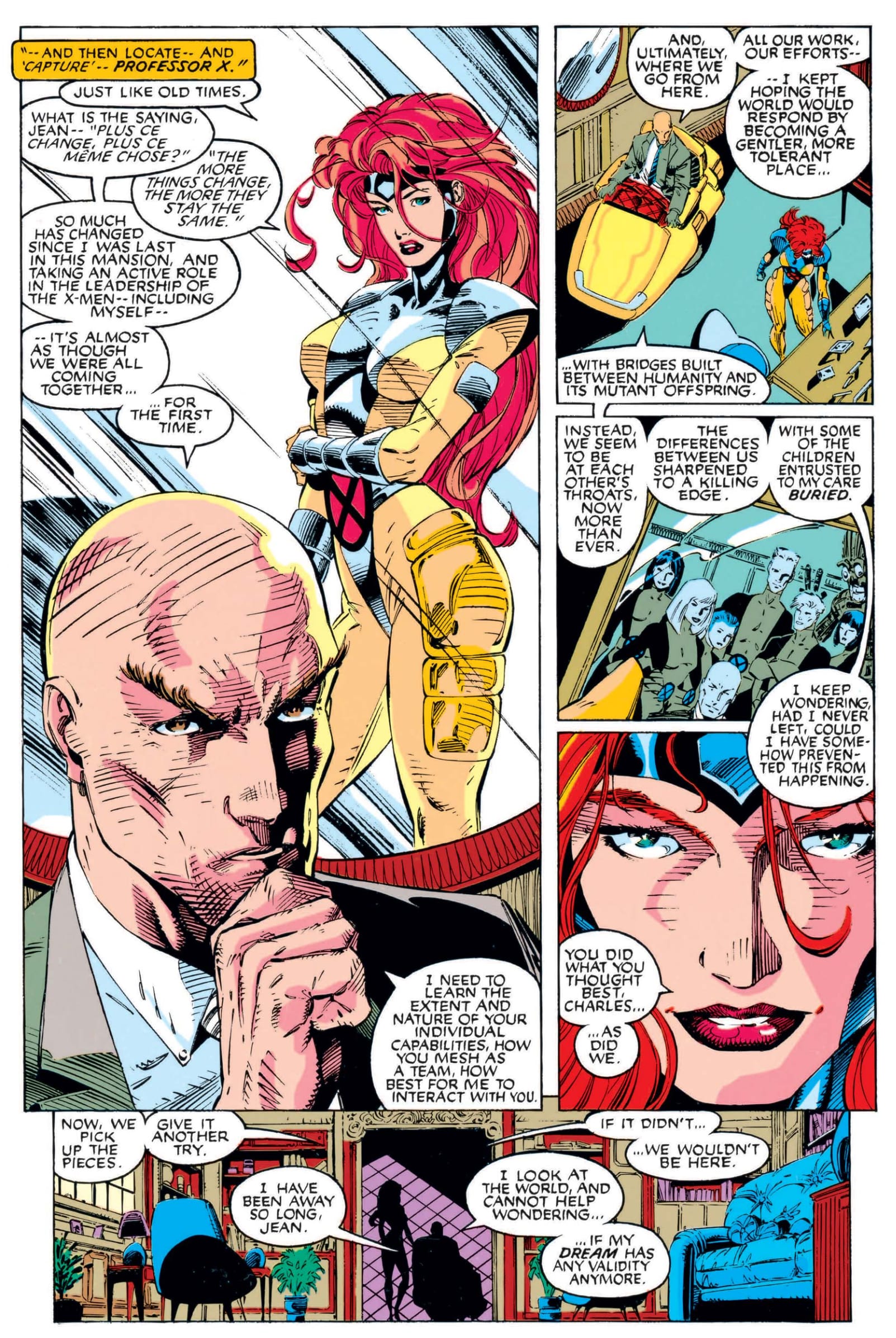 “What’s the saying, Jean- ‘plus ce change, plus ce meme chose?’” Xavier asks Jean Grey in X-Men #1. “The more things change, the more they stay the same,” Jean conveniently translates for the non-French readers among us. X-Men #1 both acknowledges everything that has happened in the past 16 years, including the reformation of Magneto, and then tosses it all out the window, as if resetting everything to 1963’s X-Men #1. For one reason or another (and that reason’s name is often hypothesized to be Jim Lee) X-Men #1-3 offers retrograde storytelling, resetting this franchise (and that’s what it is at this point) back to some imaginary point in time when all mutants lived happily together at Xavier’s School For Gifted Youngsters.