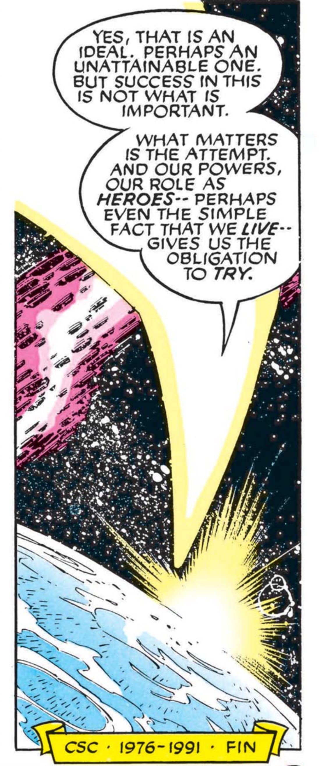 The biggest-selling X-Men comic of all time doesn’t celebrate all the accomplishments of Claremont; it tears them down to enter the 1990s and begin a phase of corporate-produced books with journeymen writers and artists picking up the reins to carry us into the hologram and foil cover era of comics. X-Men #3 ends with one final and small caption on the last panel of the issue— “CSC- 1976-1991- FIN”— reading more like a headstone message than a writer signing off from a historic run on the comic.