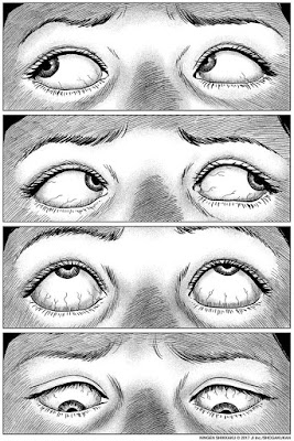 “To make those physical manifestations of bodily mutations have any kind of impact, Ito has to build up the suspense to those moments, which he does masterfully. Uzamaki is a page turner as Kirie and Schuichi’s investigations into the strange spirals out slowly but continues to get more and more dangerous with each occurrence. As clouds and dust whirl into spirals, as people start going mad, as their bodies begin turning into snails and as the food runs out and the snails are the only meat available, Ito’s madness worms its way into the reader’s mind. It’s the Alfred Hitchcock method of horror where the really scary stuff isn’t in the horrific images but it’s in the moments leading up to those twisted and monstrous bodies that jump out at you. There are many such reveals throughout the book where Ito builds up and teases out the tension and each next one keeps multiplying on top of the last. ”