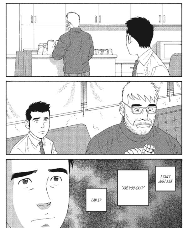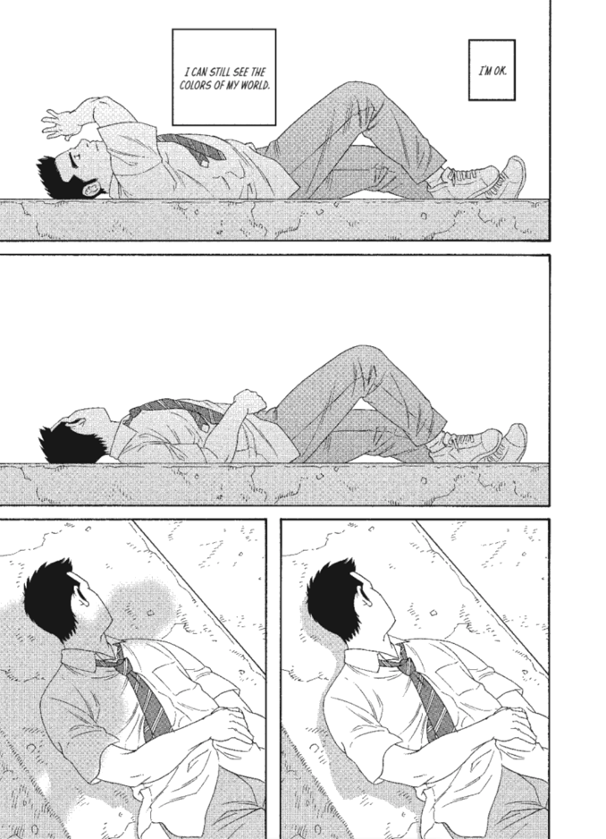 This brings us back to the idea of what is normal anyway. All Sora wants to ask the person he’s interested in out on a date or something. And it’s normal to be scared of that, to be scared of what the person might say or do. But when you say a boy wants to ask another boy out on a date, is that normal? Shouldn’t it be? In Sora and Mr. Amamiya, Tagame unveils how the pressure of not being what some would judge as “normal” weigh on these characters’ souls and how it beats at them. That pressure ends up being both external and internal as these men have been raised to think one way, the “normal” way, but discover that they’re something else, still normal but ultimately just different. That’s where Tagame is searching and finding his empathy as Sora and Amamiya learn that they are normal. It’s not them who have to adjust to the world; it’s the world that has to accept them just as it accepts everyone else.