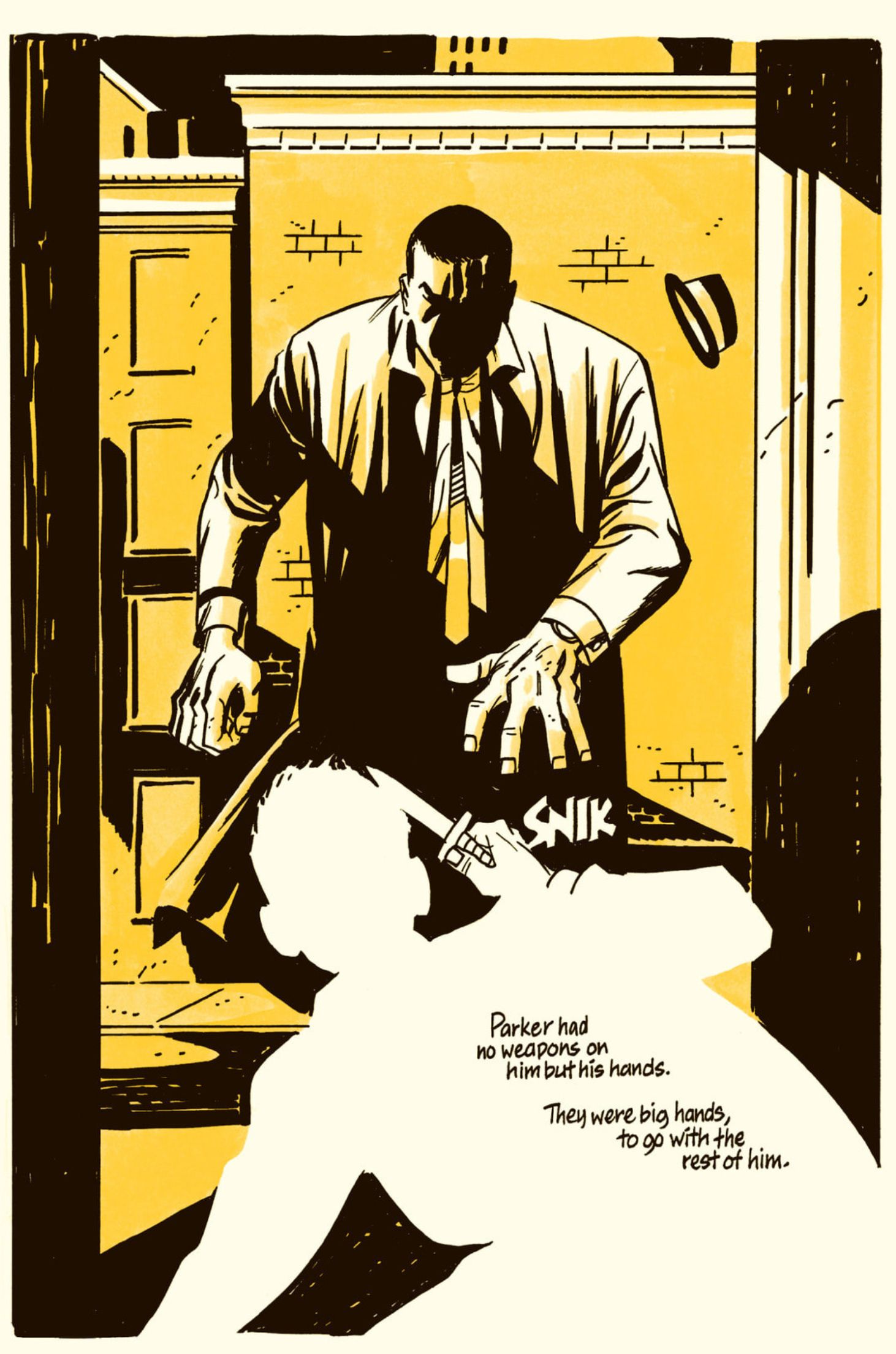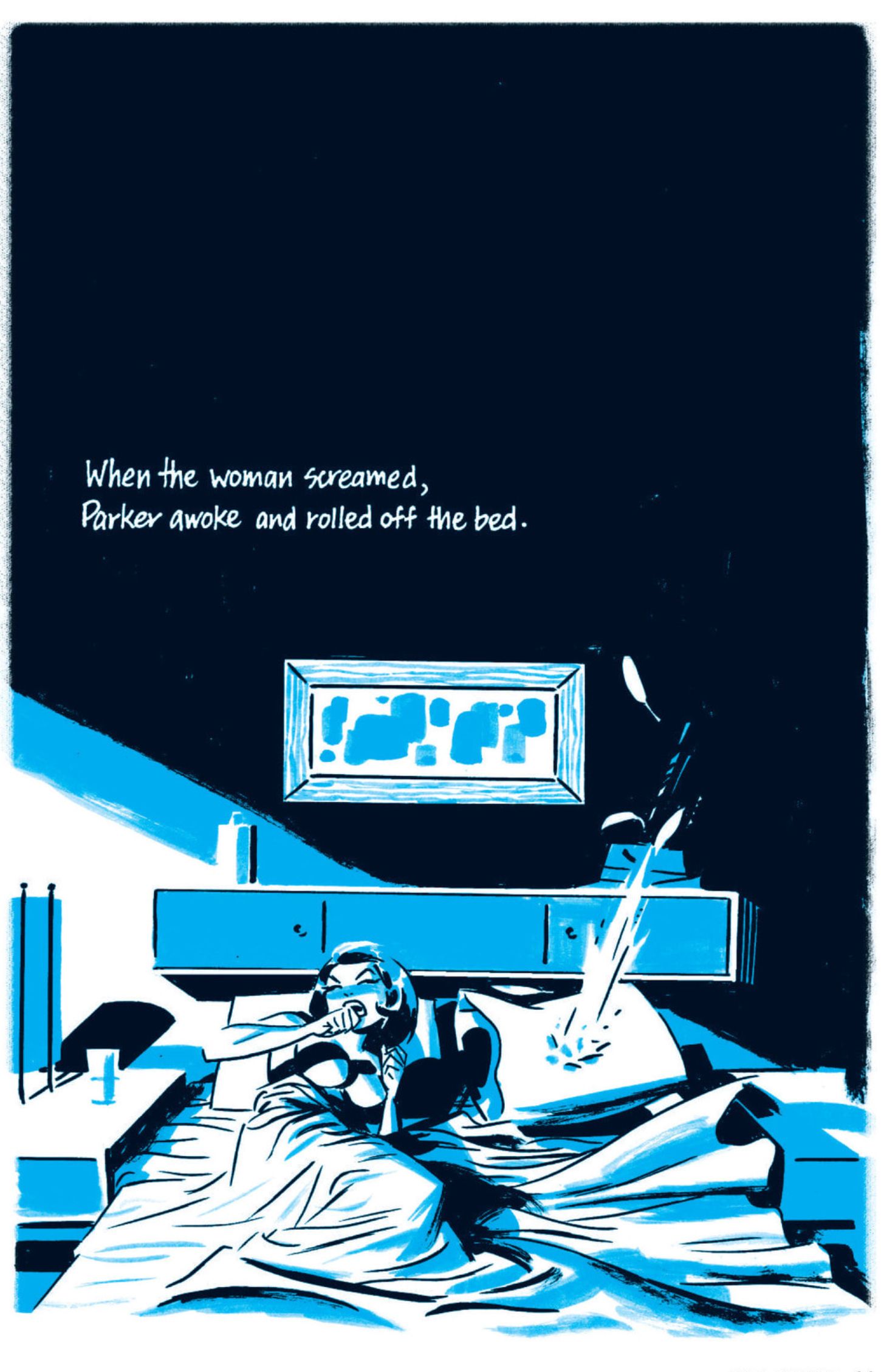 The Outfit opens quite literally with a bang— a woman screaming and a pillow where Parker’s head was just a moment before exploding from a bullet ripping through it. It’s a hell of an introduction: “When the woman screamed, Parker awoke and rolled off the bed.” The next couple of pages are Parker reacting to and taking care of the gunman sent to kill him. For two of the pages, you don’t even see that there’s someone else in the hotel room other than Parker and the gunman. Cooke focuses on just these two men and the precision (or attempted precision) of their work at this moment. It’s only in the final page of this four-page sequence that you’re reminded of the witness to these events. It’s a full-page shot of Parker, the first we see of him out of shadow, standing in the room, with a woman still in the bed behind him, clutching the hotel sheets to her chest, looking on with a mixture of fear, excitement, and fascination.
