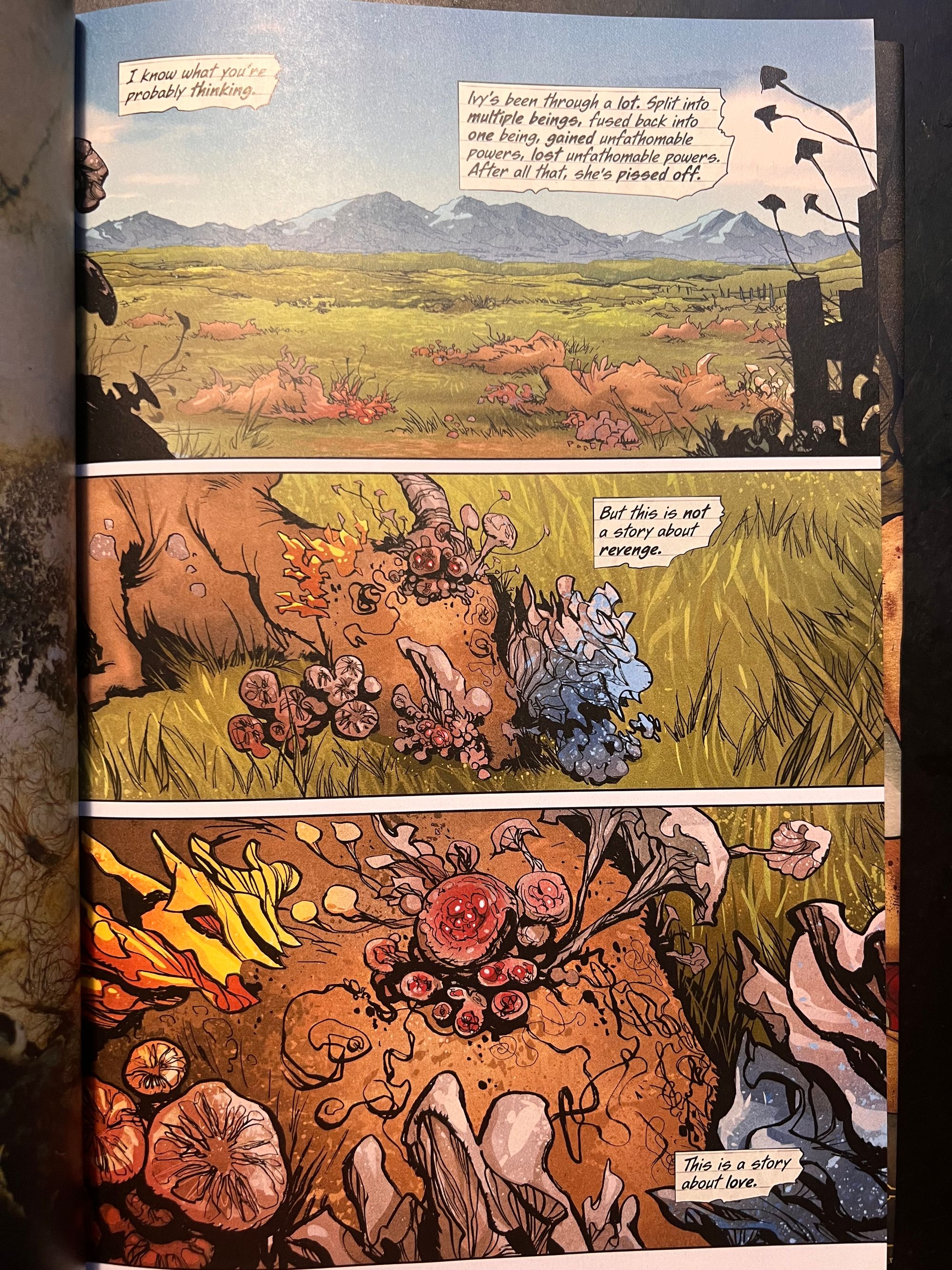 Having been mostly depowered in whatever happened in the past, Isley begins a road trip out to the west coast to try to find the one person who can help her regain her lost glory. But Wilson and Takara quickly establish that this trip is more than just a journey to reconnect with someone from Isley’s past, trying to recreate some magic that’s been lost— this is a revenge story where Isley plans to scorch the earth behind her, killing the humanity that’s ravaged the nature that she’s been so intimately tied to in the past. Wilson writes Ivy as a pure anti-hero; she may be our protagonist and written from a sympathetic point of view but from nearly any other perspective, she’s the rough beast slowly slouching towards the west coast with a righteous anger pushing her forward.