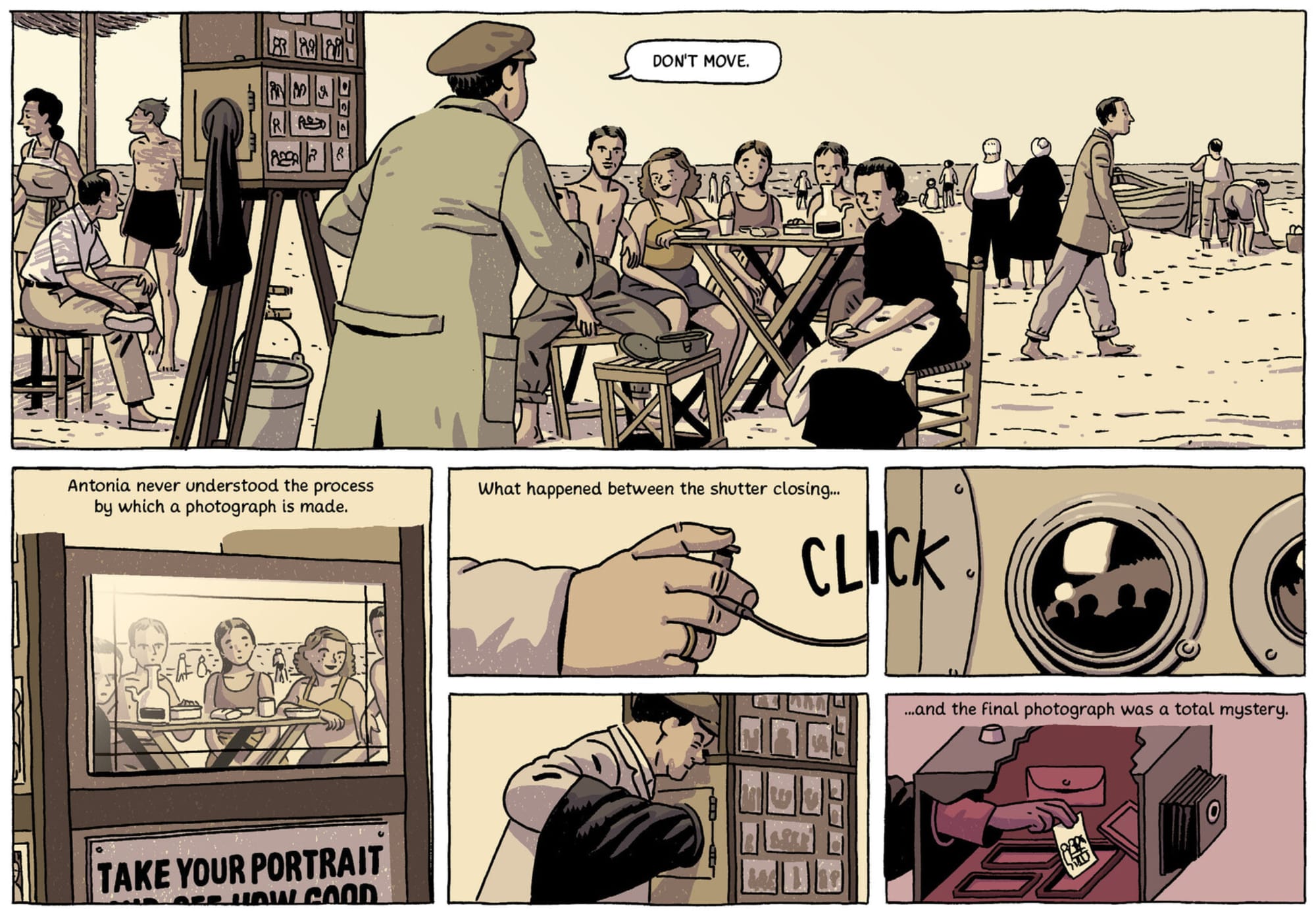 A companion piece to The House, the book where Roca tried to figure out his late father as they cleaned out his house after his father’s death, there’s a mystery about his mother and her attachment to this photo. Out of everything that his mother could long for as she moves out of her own home and in with one of her children, it’s this picture that means everything to her. This was one of the earliest pictures of her that was ever taken. The first was from when she was a young girl with her oldest sister and her fiance, a “typical studio portrait, in which the betrothed pose in their nicest outfits, gazing with feigned interest at a point outside the frame.” The second photo was years later when Antonia was working as a nanny, together with the girl she was caring for on a toy horse. Interestingly, Roca includes both pictures in his comic (as well as the eventually found missing one.). His mother had kept both of those all that time but they weren’t treasured nearly as much as the one from that day at the beach. They didn’t sit on the nightstand by her, watching over her as she slept.