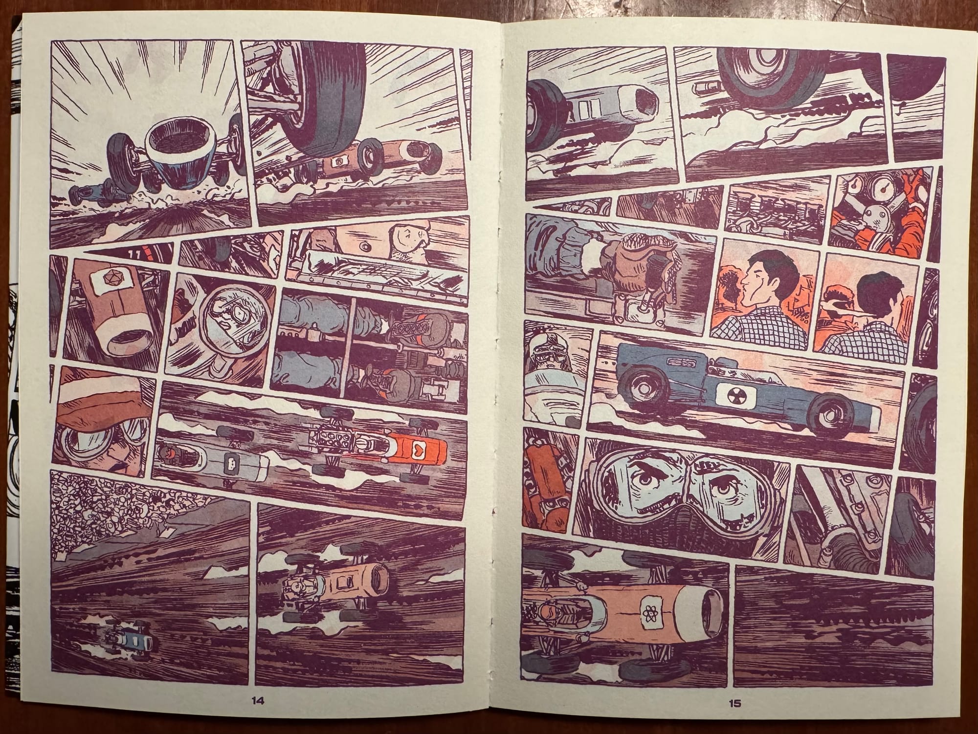 When Lonergan is drawing the race, you can see how every panel, the framing of each image, the tilt of the panel, and even the colors draw your eye through the story. Here Lonegran is sculpting time through the page, pulling at it like taffy to manipulate it and our experience of it. The sequence above keeps your eye darting through it. This is a two-page spread that’s easy to read; the tiers of the page create three distinct phrases— the top and bottom tiers focusing on the speed and energy of the car race. And then in between the cars, these quick, staccato panels focus in on the races, still maintaining the speed and velocity of the race but bringing them down to the human element of the race— the drivers and spectators trying to keep up with all of the action. Lonergan pulls us into the story on this page, caught up in all of the action and drama of the comic.