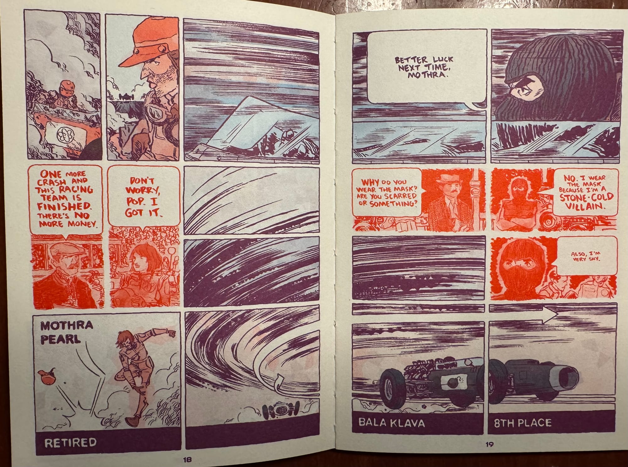 As he builds his pages in Faster, you need to pay attention to where Lonergan zigs in his storytelling when you expect him to zag. Pages 18 and 19 stick us right behind the steering wheel of the cars but then he pulls us briefly out of the race with the red panels that take us to the moments before the race— the desperation and the aloofness of the racers that make the race all the more thrilling. This isn’t necessarily a story about the racers but Lonergan finds the space in the story to give us these small little personal insights into the racers to make them more than just NPCs in this story. These red panels become a signifier throughout the book that we’re stepping into an aside without ever breaking up the flow of the race.