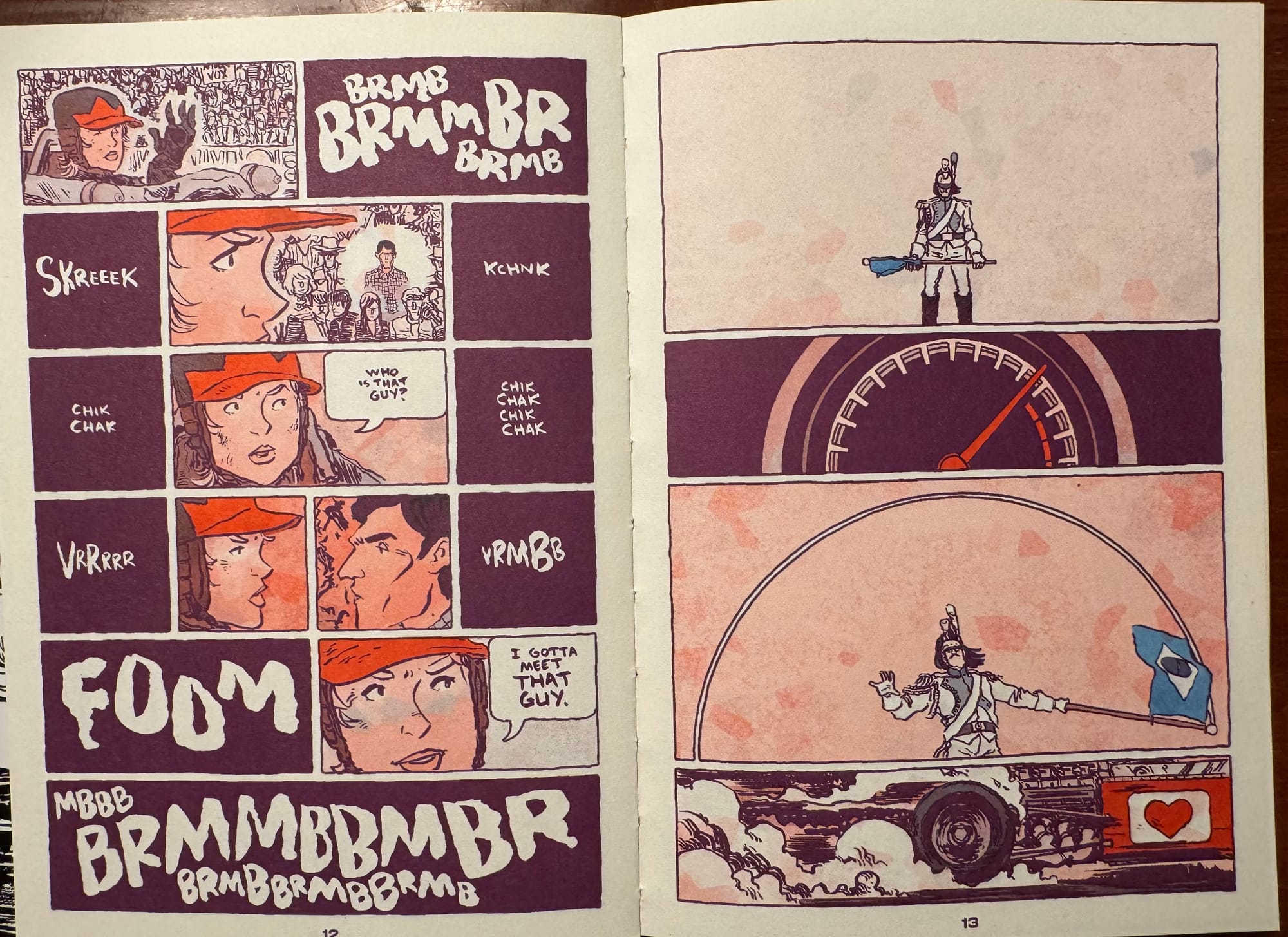 Lonergan knows that the comic page is more powerful than just being a storyboard, just moving us forward a little bit in time with each panel. The page is a living, breathing thing and even as we’re moving through time, we’re moving through space, emotions, and sensations. You can go from a page that’s a fairly literal pre-race moment that still communicates the mounting tension through sound effects that amp up the rumble of the engines, to a page that’s fairly abstract storytelling, repeating circles and stretching out the wave of the starters flag over the whole page, honestly maybe my favorite page of the book. The way that Lonergan pulls in and out of the page, repeating the curved shape of the wheels in three of the panels, creates a pulse to this story. It’s not a literal moment-to-moment page but more of a statement to prepare us for race.