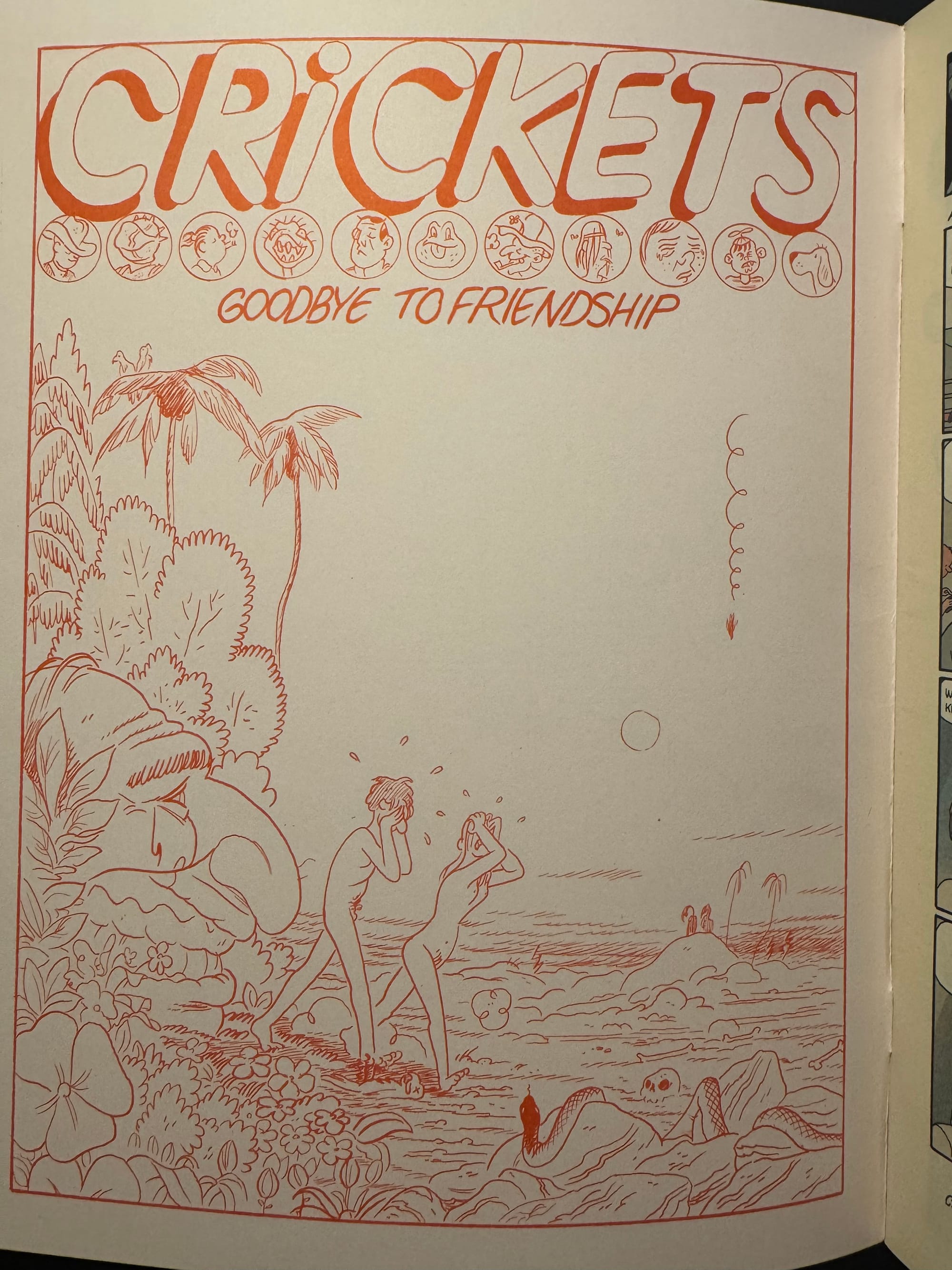 And then the mystery continues on the inside cover where a new subtitle is introduced— “Goodbye to friendship.” So here things become a tad clearer. In most of these stories, we see various friendships explored. But the imager on the front piece seems more related to “sing, you sinners.” Harkham draws Adam and Eve’s expulsion from Eden, expelled out of paradise and into a wasteland. But even there, could Harkham be trying to tie the breakup of Adam and Eve’s relationship with God to the other friendships we encounter in this issue?