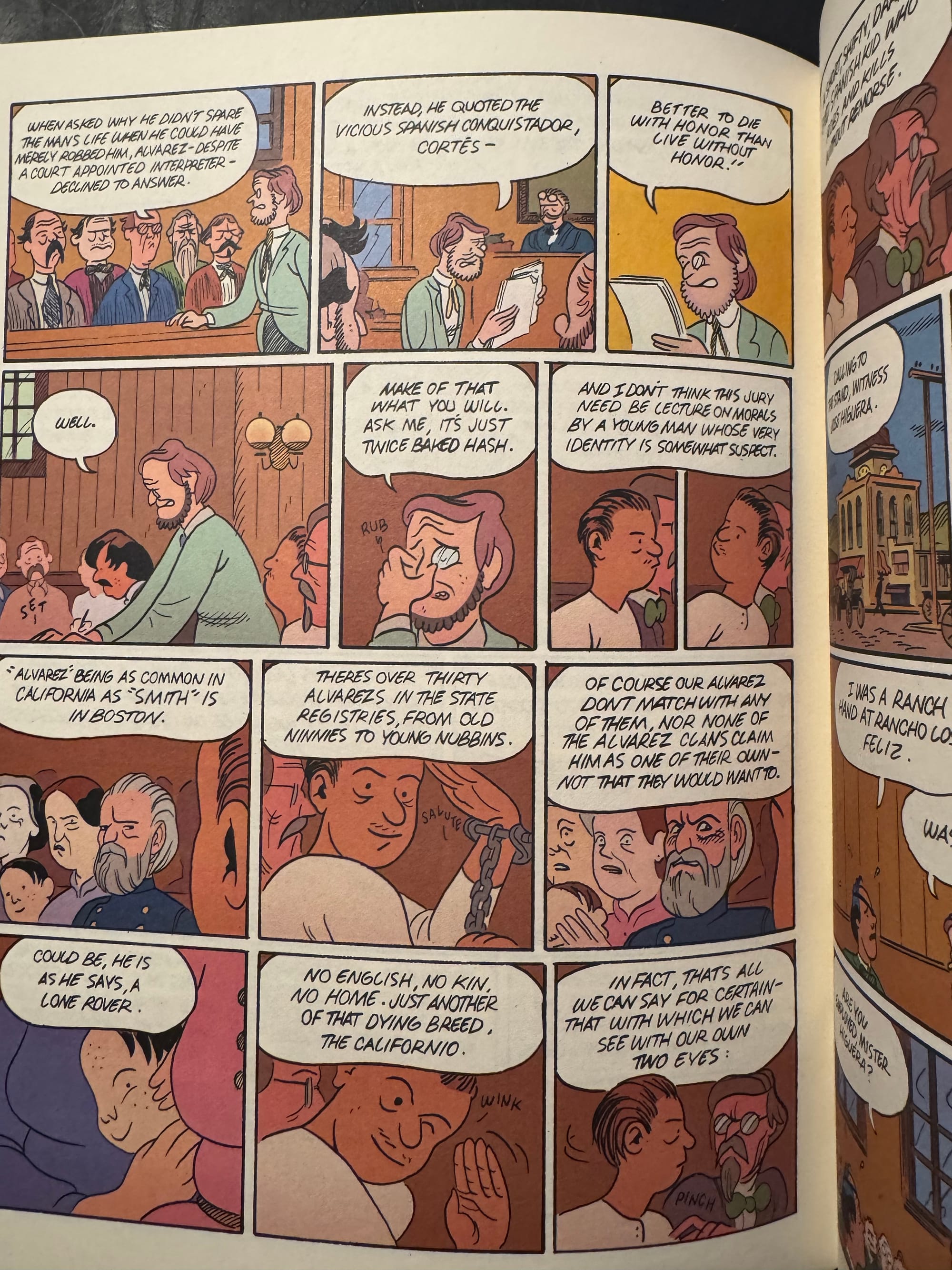 In “The San Fernando Kid,” the beginning of his long-form follow-up to Blood of the Virgin, Harkham tells the story of a man who may or may not be named Alvarez. In court, as a prosecutor argues Alvarez’s guilt in killing a man over $600 and a horse, the lawyer tells the jury “‘Alvarez’ being as common in California as ‘Smith’ is in Boston. There’s over thirty Alvarez’s in the state registries… none of the Alvarez clans claim him as one of their own…” Just who this man is remains part of the continuing mysteries of this issue.