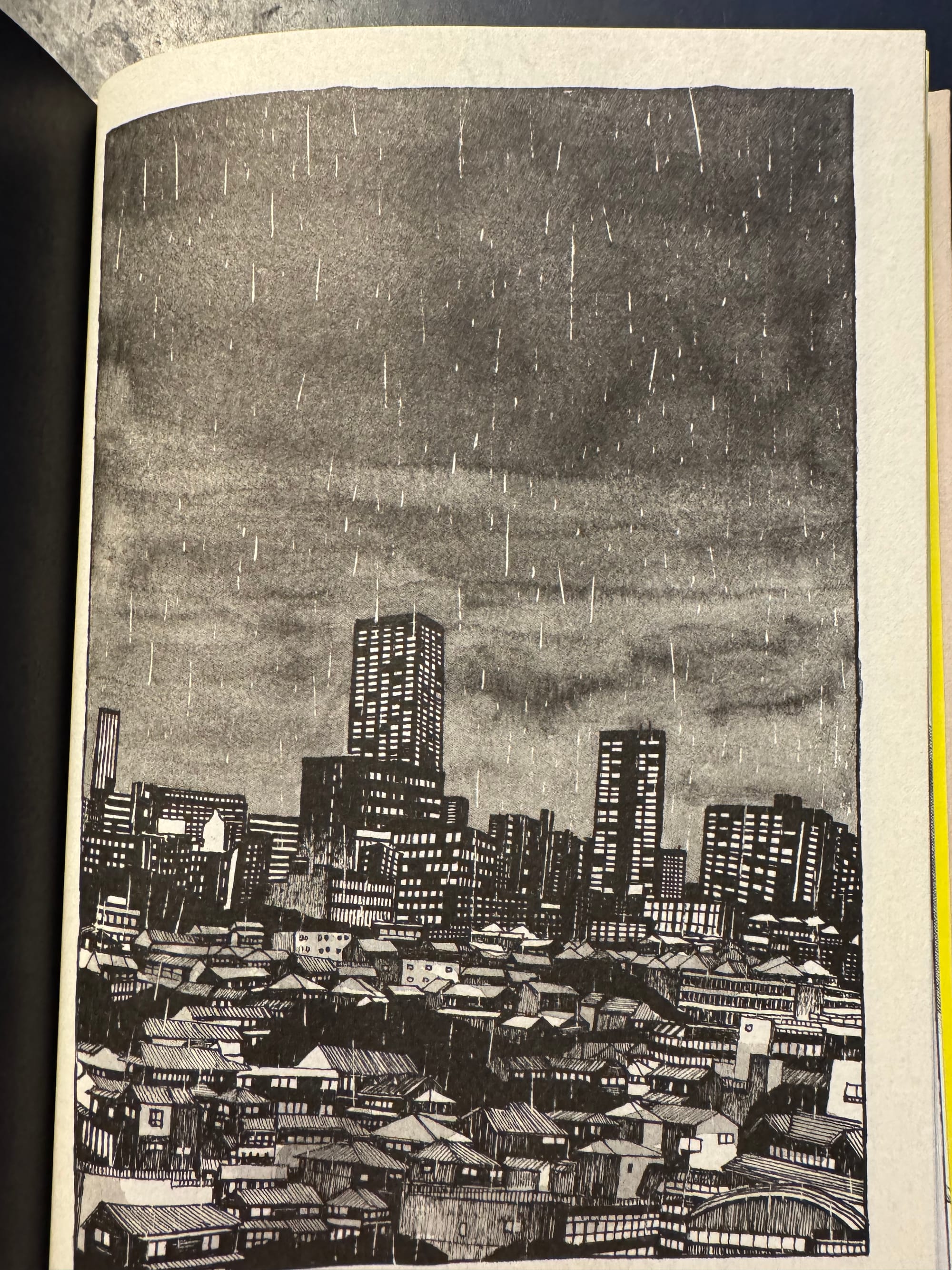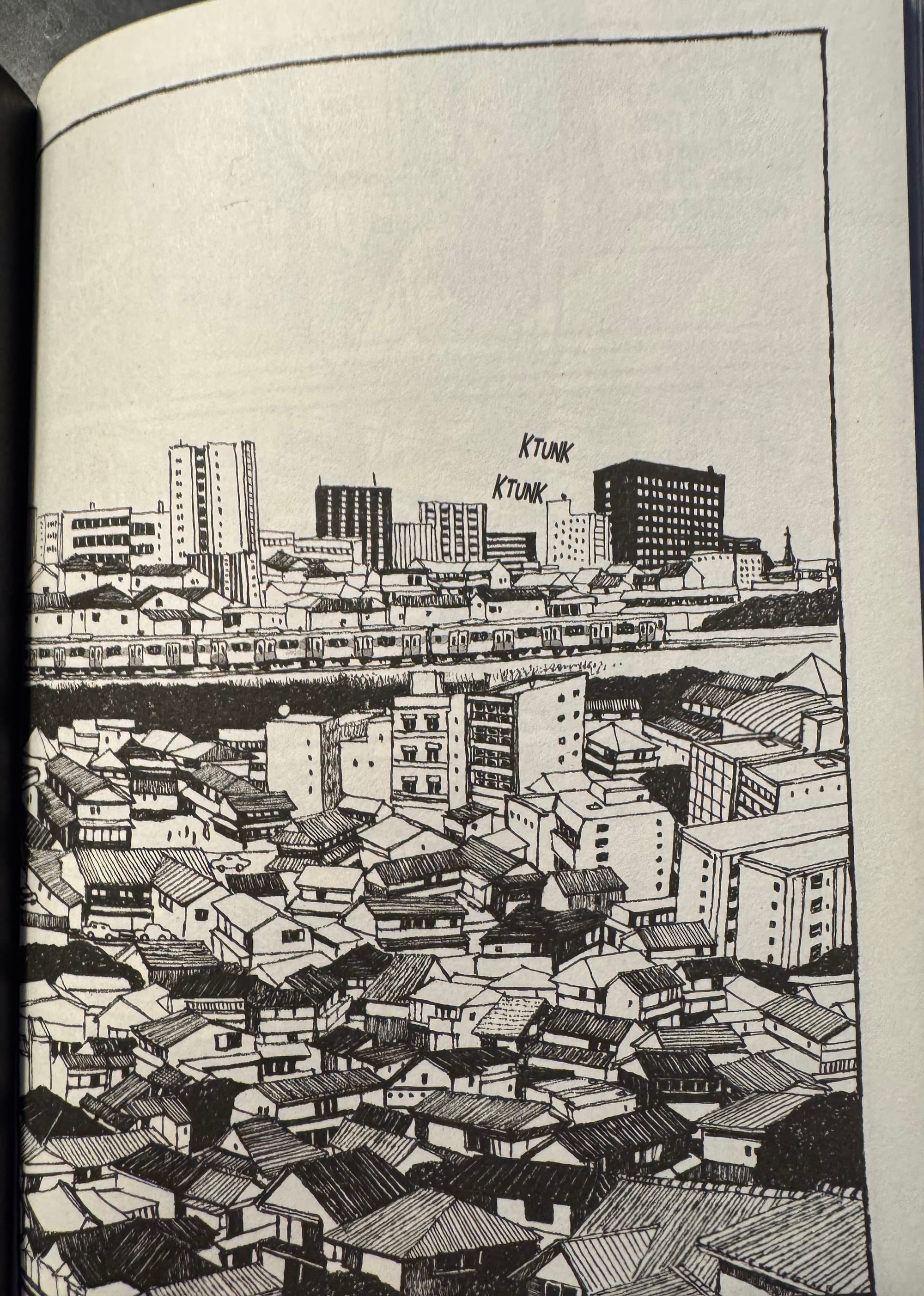 In Tokyo These Days, Matsumoto uses solid black pages for the chapter breaks- two pages in between the chapters to control where they end and begin. They lead you out of the chapter— a strong and definitive fade-to-black approach for each narrative chapter. These black pages serve as the transition marker from one chapter to another, from one narrative thought to another. So the drawings of Tokyo that conclude each chapter have another function in this story; they are not there to move us from one part of the story to the next. They are the punctuation that makes us stop and pause for however long we need to take before we move forward in this story.