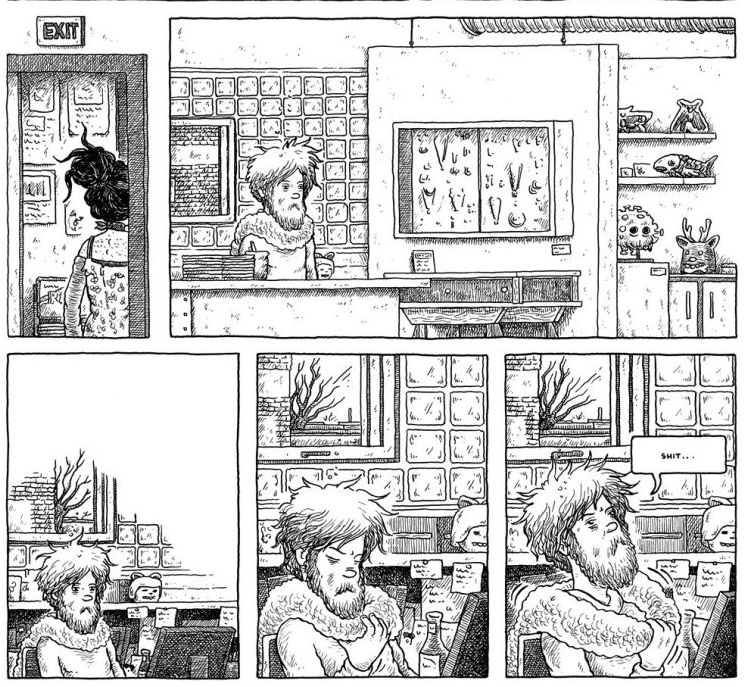 This kind of unexpected connection highlights the series’ gradually increasing focus on ways of thinking about and visualizing the world. The second volume includes a lot more of this interstitial drawing. In some places, the lines weave between panels, their shapes filling in the gutters and drawing literal connections between the curve of a cloud in one panel and the spindly autumn branches of a tree on the facing page. Indeed, the second volume opens with a single dot expanding to a line, then a dense tangle that gradually coheres into an aerial view of an airport’s layout, leading into the opening image.